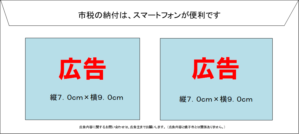 申込は「銚子市納税通知書送付用封筒広告掲載申込書」に必要事項を記入の上、添付書類を添えて、銚子市役所 税務課 課税室あてに郵送、または市役所1階 税務課 課税室 7番窓口までご持参ください。(メール不可)