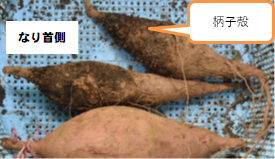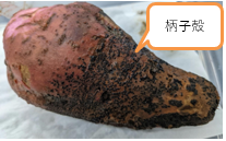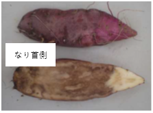 サツマイモ基腐病は、茎が地際部から黒変し、サツマイモが腐る病気で、主に「種イモ」や「苗」から伝染します。早期発見、感染拡大防止のため、貯蔵中や出荷調製時のイモに、なり首側からの腐敗がないか確認してください。写真と似た症状が見られる場合は、最寄りの農業事務所までご連絡ください。
