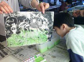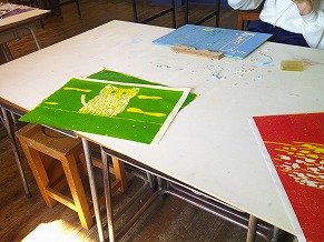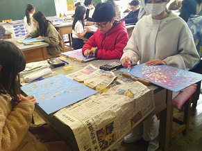 1月27日(金)、年明けにスタートした版画の制作がいよいよ完成します。高学年の多色刷りは、色を重ねるたびに変化があって仕上がりが楽しみです。低学年の紙版画も、絵の具で色を入れると、黒一色とは違った出来上がりになります。
