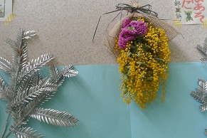 掲示板には、お正月を迎える鏡餅や凧を掲示しました。校庭のあちこちに咲き始めたスイセンを、スクールサポートスタッフが活けてくれました。廊下には、冬休みに行った書初めを掲示してあります。