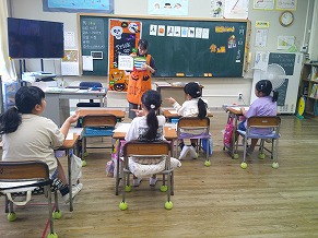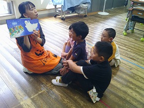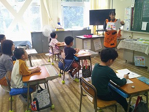 10月7日(火)、外国語の先生が、ハロウィンについて、1、2年生に教えてくれました。楽しく遊んだり、英語の本の読み聞かせをしてくれました。