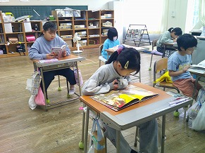 定期的に、図書館司書の先生が来てくださって、図書の整理をしたり掲示物を作ったりして、図書室の環境整備をしてくれています。いつも、読み聞かせもしてくれます。今回は、日本や世界の昔話でした。