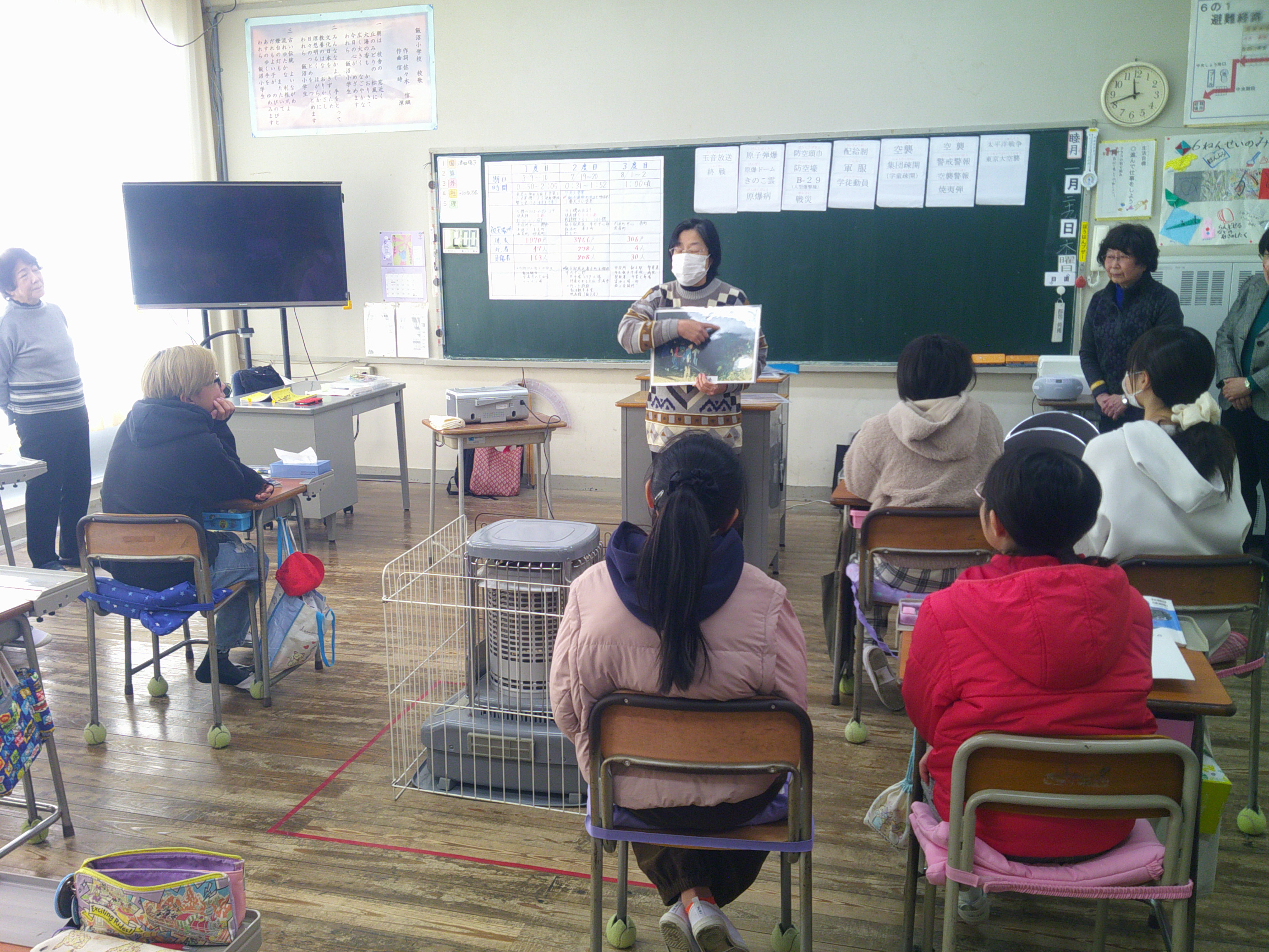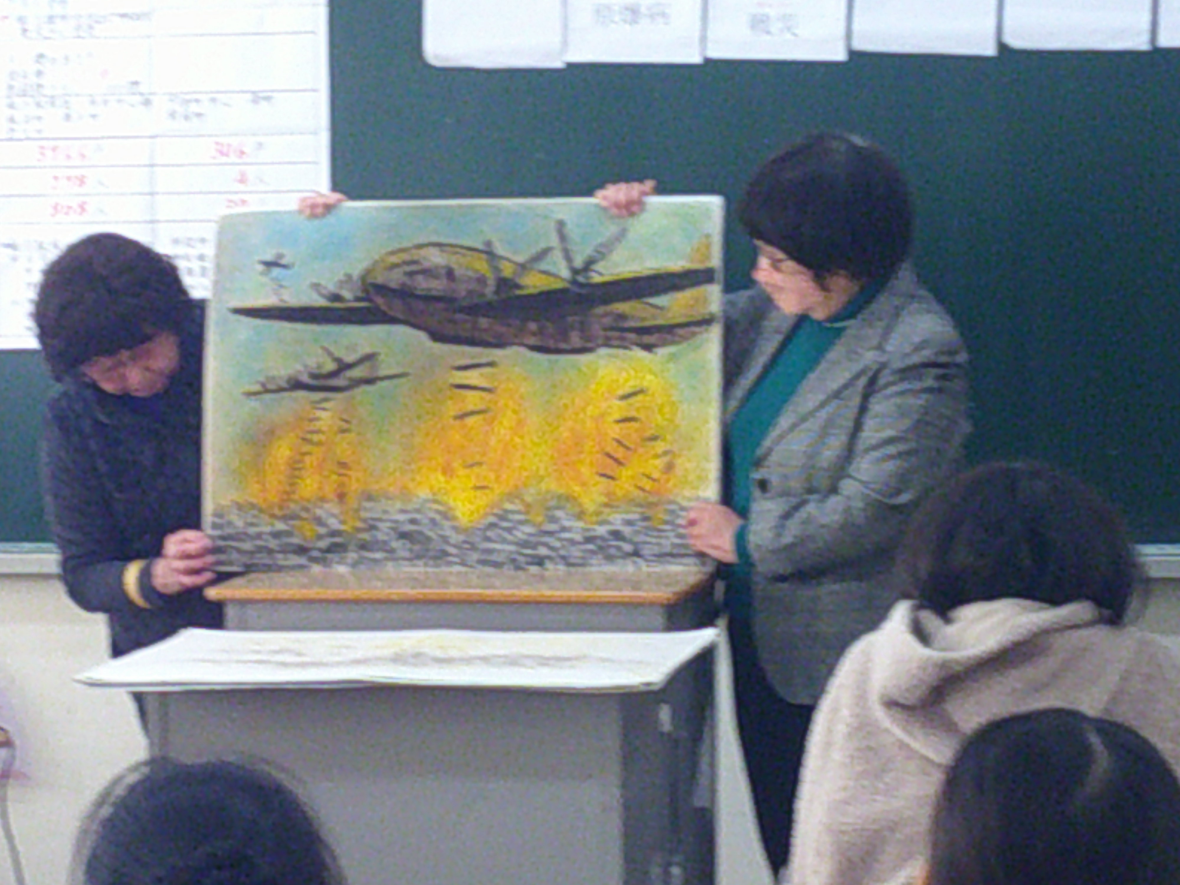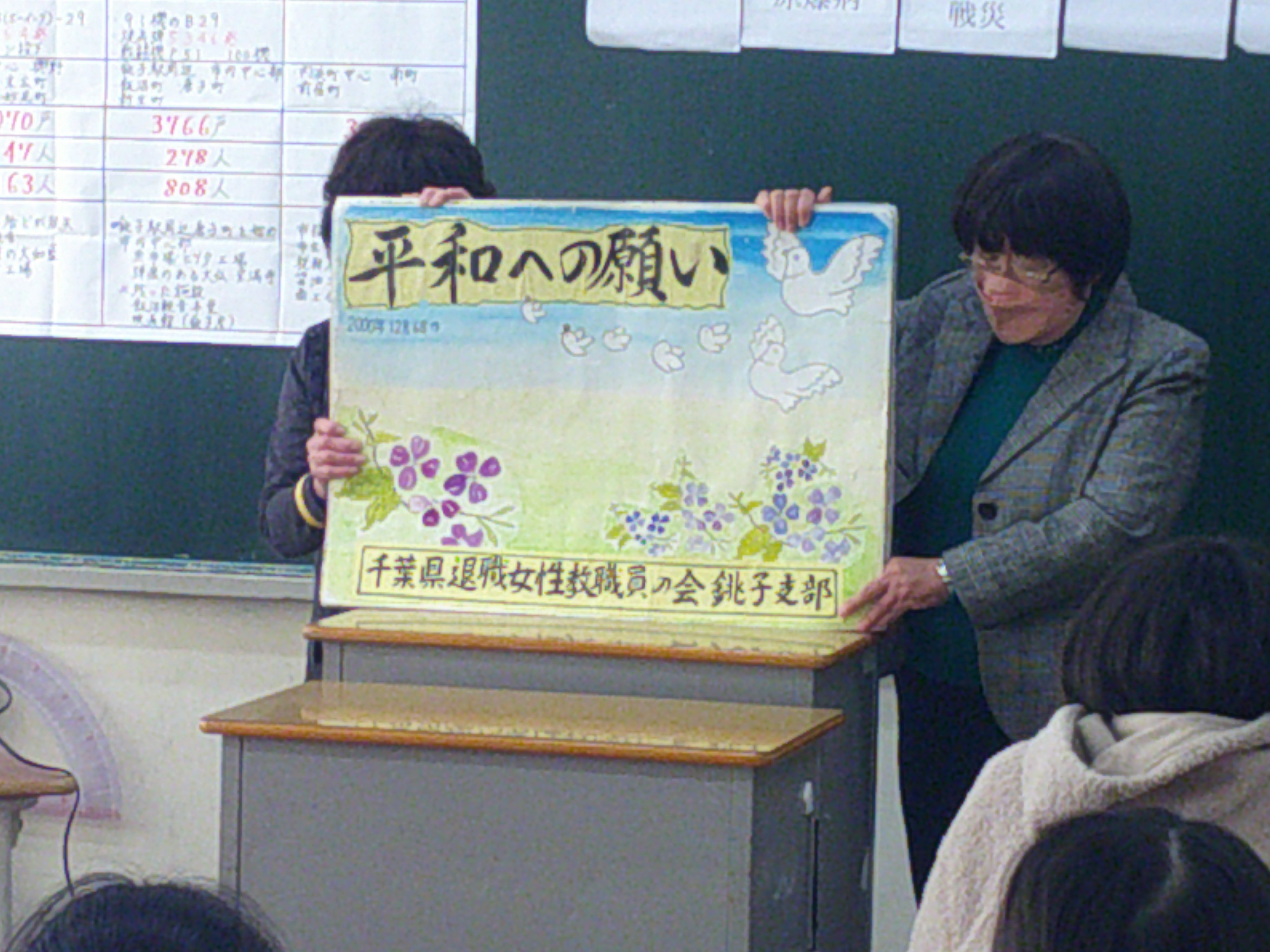 1月29日(木)、千葉県退職女性教職員の会銚子支部の方々が、紙芝居で、戦時中の銚子市の様子を話してくださいました。銚子市でも多くの家が焼かれ、命が奪われたことを知りました。平和への願いをこめた折り鶴もいただきました。一人一人、自分の思いを書いて吊るしました。