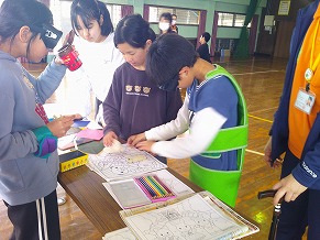 高学年は、多色刷りに挑戦です。刷り方を教える先生と彫り方を教える先生がいます。