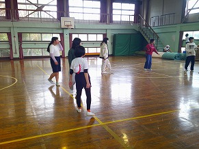 バトミントンの羽のようなものを足でけり上げる遊びを教えてくれました。みんな、夢中になって楽しく遊びました。