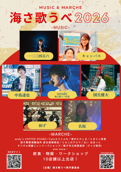海さ歌うべ2026では、音楽ステージとともに、地元のおいしいもの・すてきなモノがならぶマルシェも開催します。 出演者情報や当日のタイムスケジュールは公式インスタグラムをご覧ください。