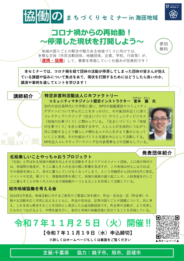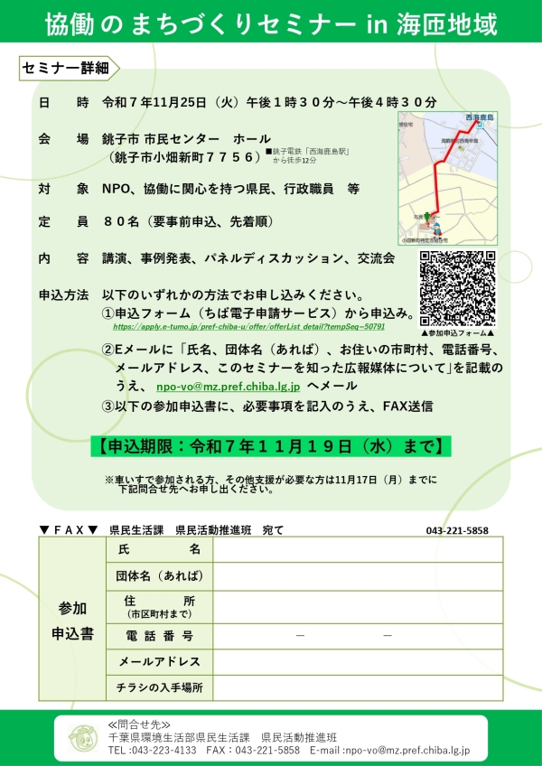 下のチラシ(PDF)の参加申込書に必要事項を記入のうえ、下記千葉県環境生活部県民生活課 県民活動推進班のファクス番号へ申込み