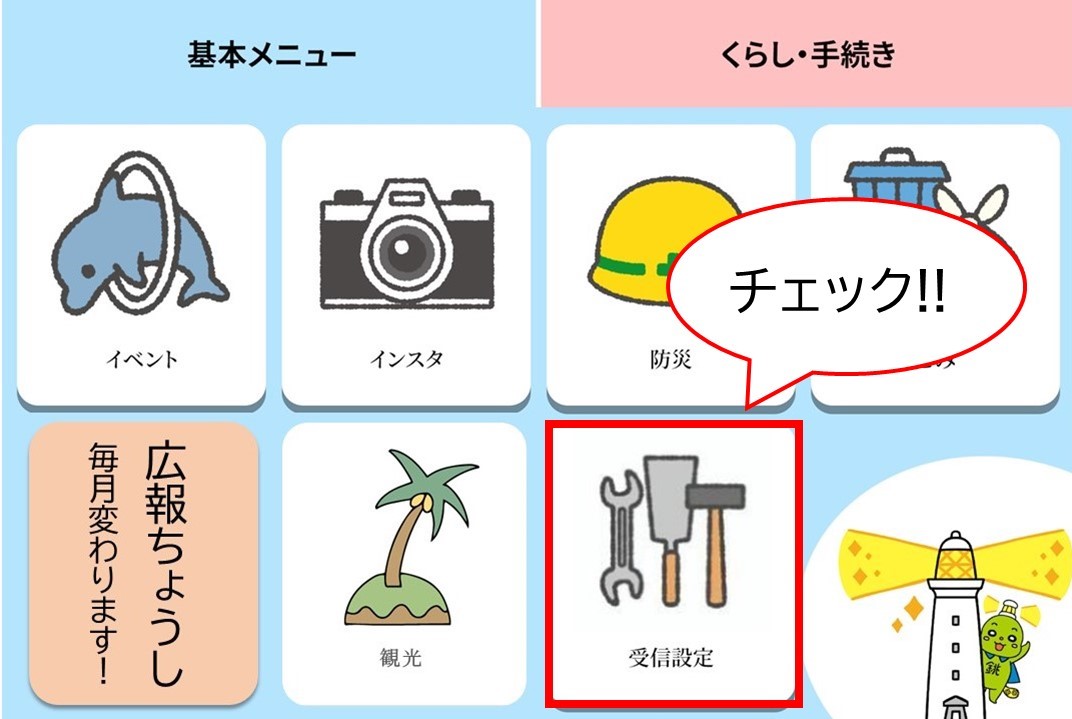 公式LINEのメニューに表示される「受信設定」から、ご自分の生活スタイルなどに応じて知りたい情報をお選びください。