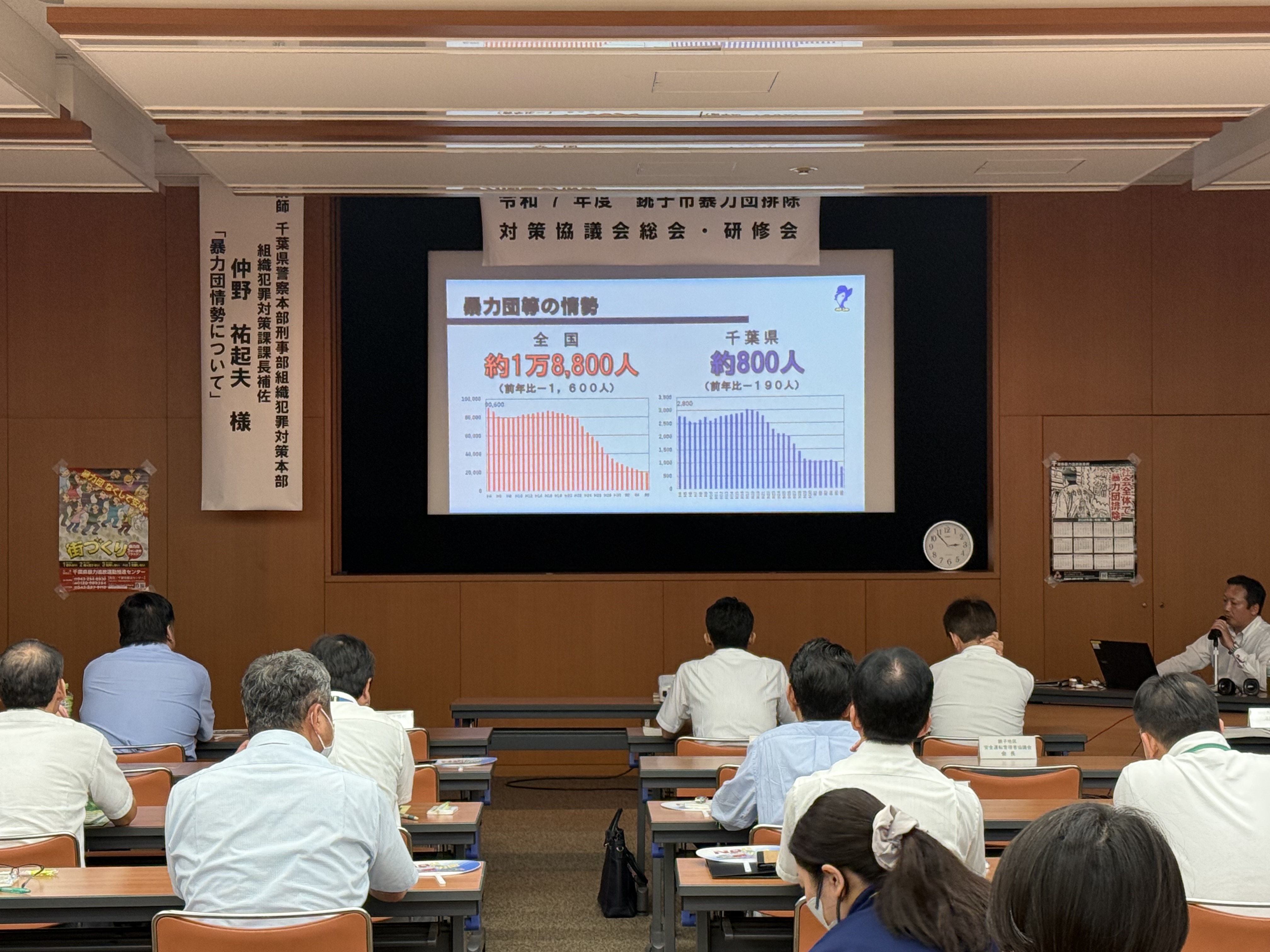 令和7年7月29日に銚子市暴力団排除対策協議会総会及び研修会を実施し、暴力団情勢や不当な要求への対応について学びました。