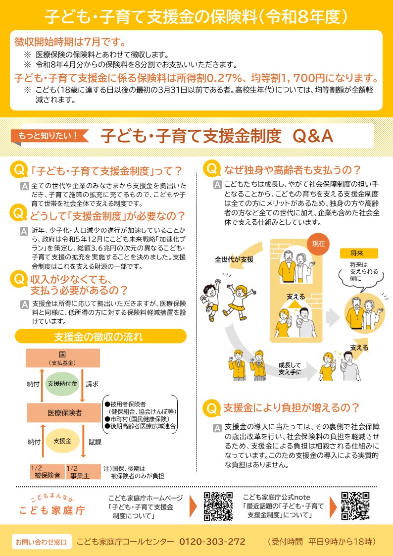 令和8年3月2日より、こども家庭庁に「子ども・子育て支援金制度コールセンター」が開設されました。