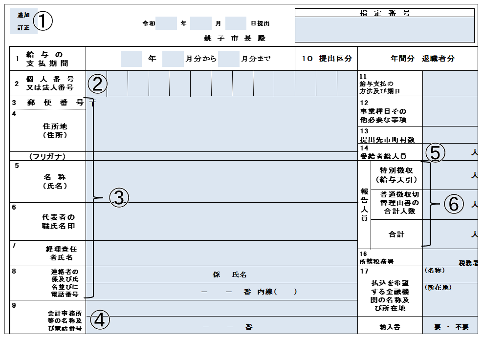 (注意)前年に銚子市への給与支払報告書の提出がある事業所には、過去の内容を印字した給与支払報告書(総括表)を送付しています。印字した内容に訂正がある場合は、朱書にて訂正してください。