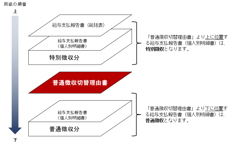 表紙に給与支払報告書(総括表)、2番目に特別徴収分の給与支払報告書(個人別明細書)、3番目に普通徴収切替理由書、4番目に普通徴収分の給与支払報告書(個人別明細書)の順で提出してください。
