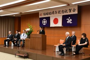 結婚50周年記念祝賀会であいさつをする市長の様子(9月6日・保健福祉センター)