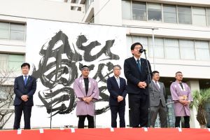 ひびき連合会「50周年記念事業」開会式であいさつをする市長の様子(11月2日・銚子市役所南側駐車場)