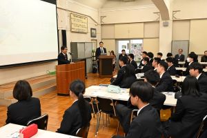 ふるさと納税ワークショップであいさつをする市長の様子(11月11日・県立銚子商業高等学校)