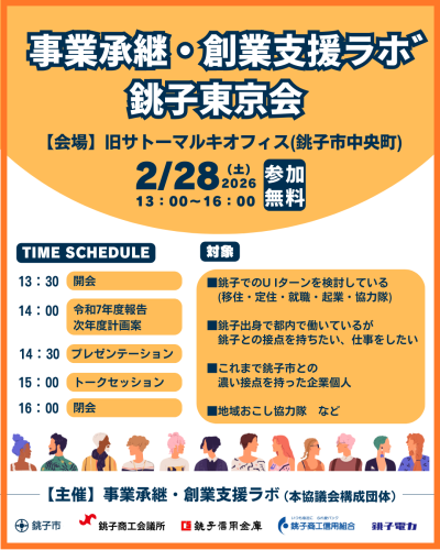 「事業承継・創業支援ラボ」が主催し、市外の創業希望者や市内関係者等との交流を促進するため、市内にてイベント(銚子東京会)を開催します。