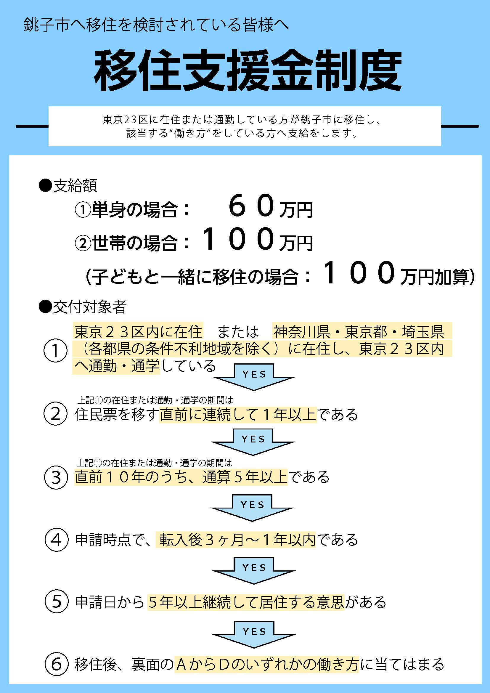 銚子市への移住及び定住の促進並びに中小企業等における人手不足の解消を目的としており、東京23区に在住する方や東京圏に在住し、東京23区に通勤する方が、銚子市に移住して一定の条件(就職・テレワーク・関係人口・起業)を満たす場合、予算の範囲内で補助金(2人以上の世帯:100万円、単身世帯:60万円)を交付する制度です。