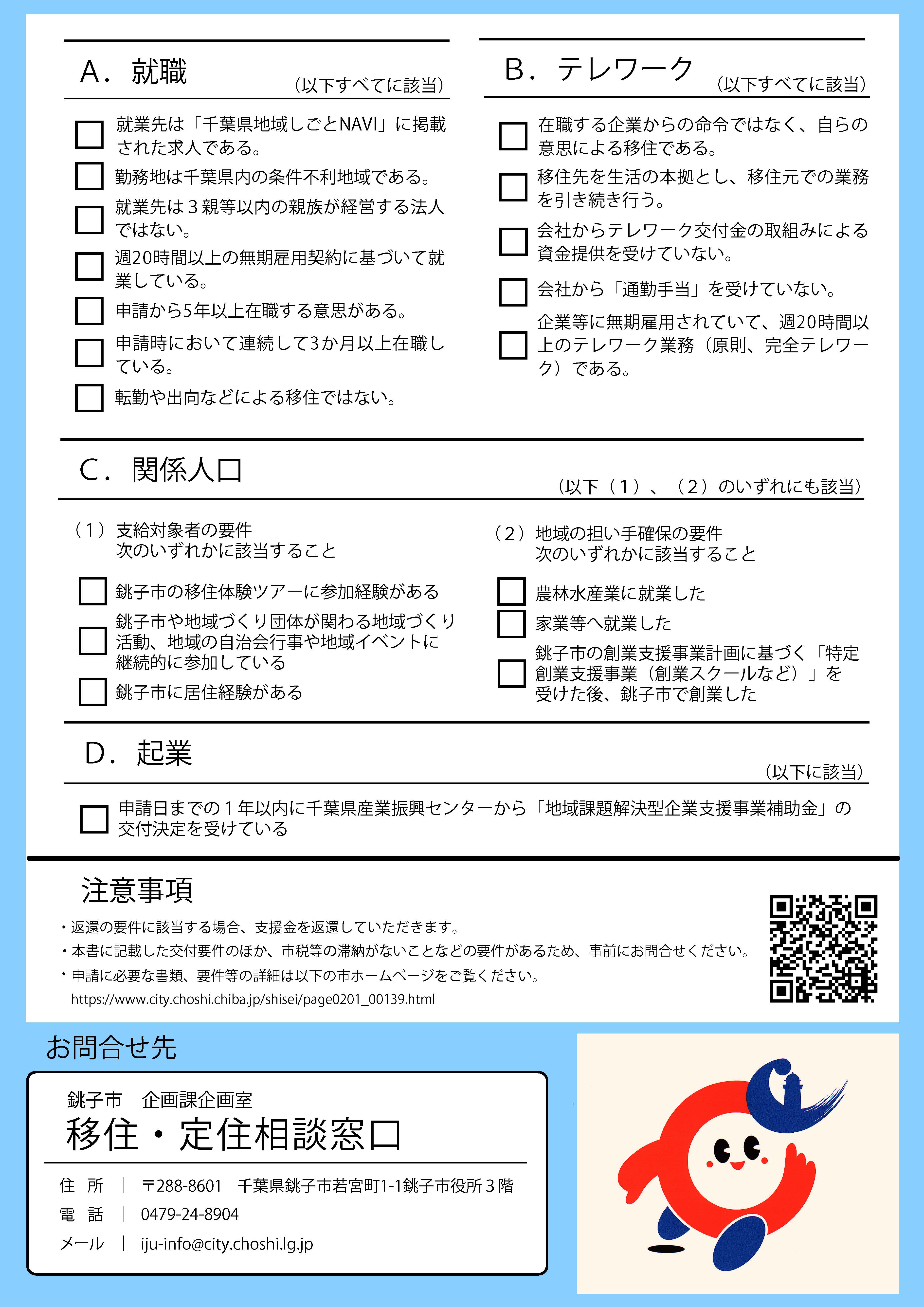 銚子市UIJターンによる起業・就業者等創出事業補助金交付要綱第5条に基づき、下記の必要書類を企画課企画室に提出してください。