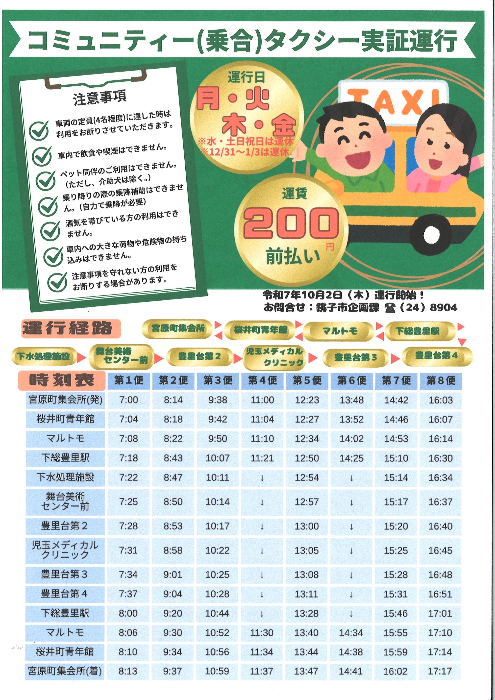 | 下総豊里駅 | 7:18 | 8:43 | 10:07 | 11:21 | 12:50 | 14:25 | 15:10 | 16:30 |