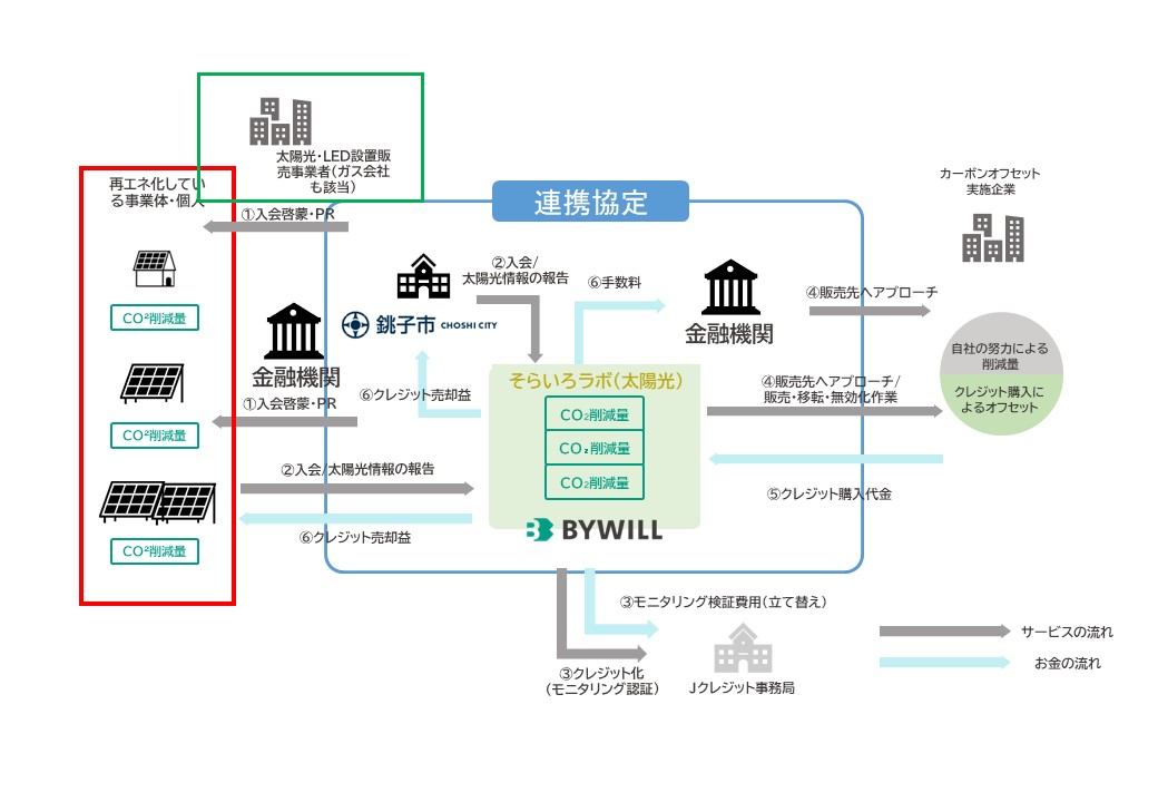 銚子市住宅用設備等脱炭素化促進事業補助金の交付手続きにおいて当会に入会いただいた各家庭の太陽光発電設備等によるCO2排出削減量を、当会の運営管理者である株式会社バイウィルが取りまとめ、J-クレジットを創出し、創出されたJ-クレジットを市が同社と銚子信用金庫、銚子商工信用組合と協力し、ゼロカーボンシティ推進事業に活用していきます。