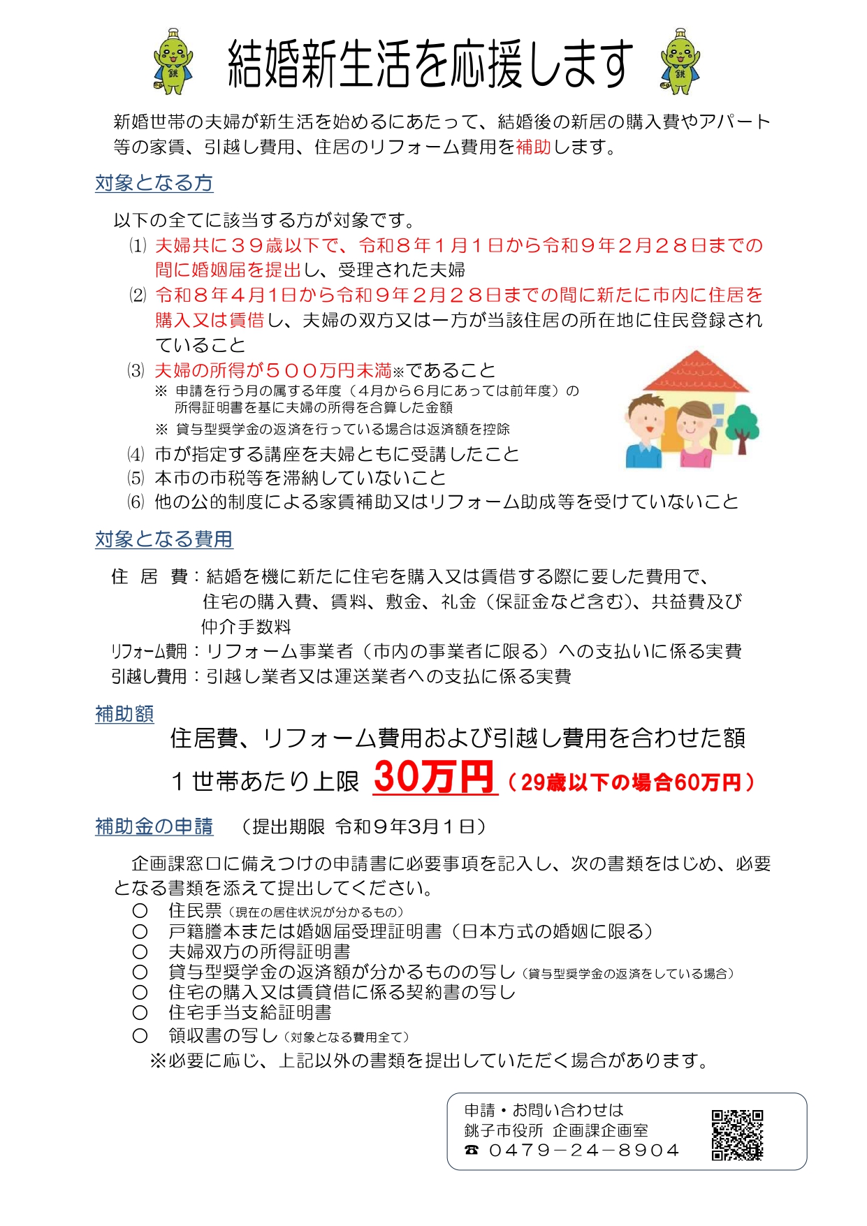 銚子市では、国の令和7年度地域少子化対策重点推進交付金を活用して、結婚新生活にかかる住居費、リフォーム費用や引っ越し費用の一部を補助することで、若者の希望を叶え、未婚化・晩婚化の進行に歯止めをかける施策に取り組んでまいります。